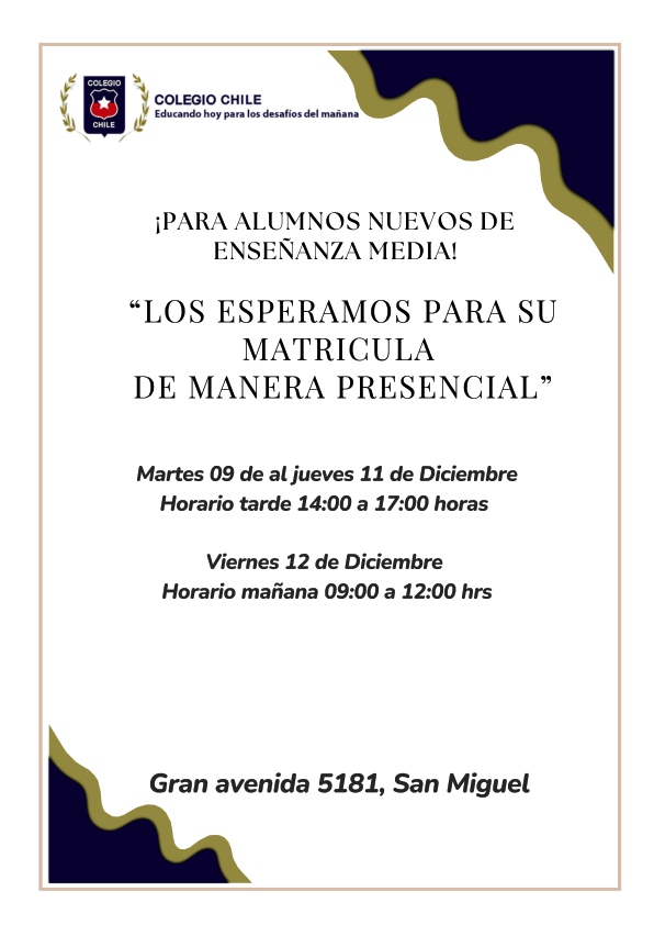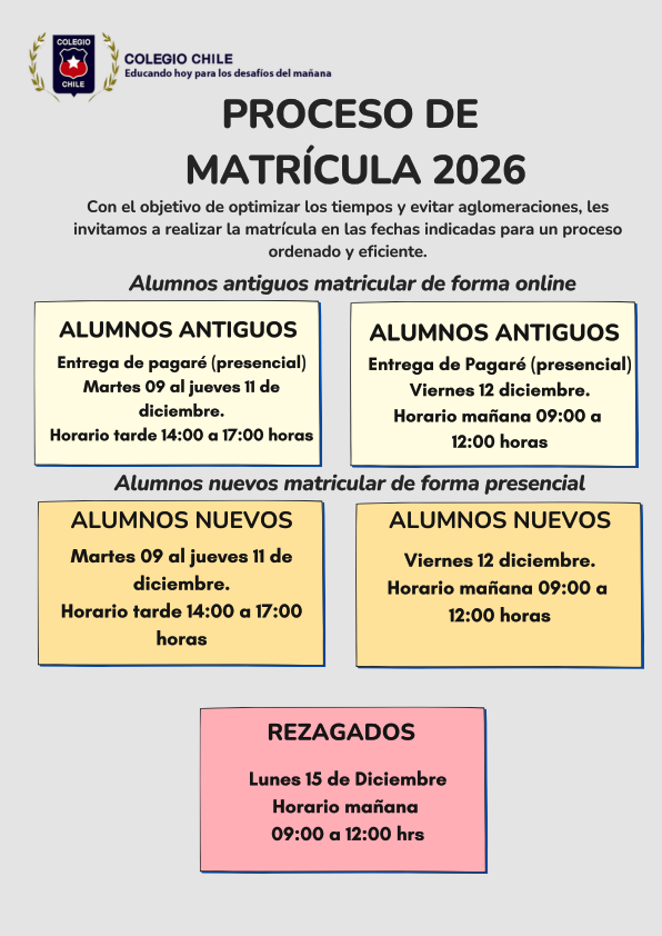2.- Los estudiantes que ya pertenecen a nuestro establecimiento y desean continuar NO deben inscribirse en la plataforma de Admisión Escolar (SAE). En caso de hacerlo, perderán automáticamente su cupo en Colegio Chile.